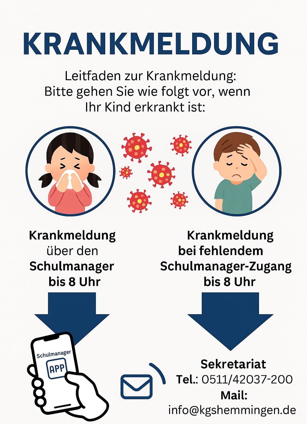Falls eine Schülerin/ein Schüler aus Krankheitsgründen o. Ä. nicht am Unterricht teilnehmen kann, bitten wir darum, Ihr Kind über den Schulmanager krankzumelden; alternativ können Sie Ihr Kind telefonisch im Sekretariat abmelden. Die Fehlzeit ist somit auch gleichzeitig entschuldigt.